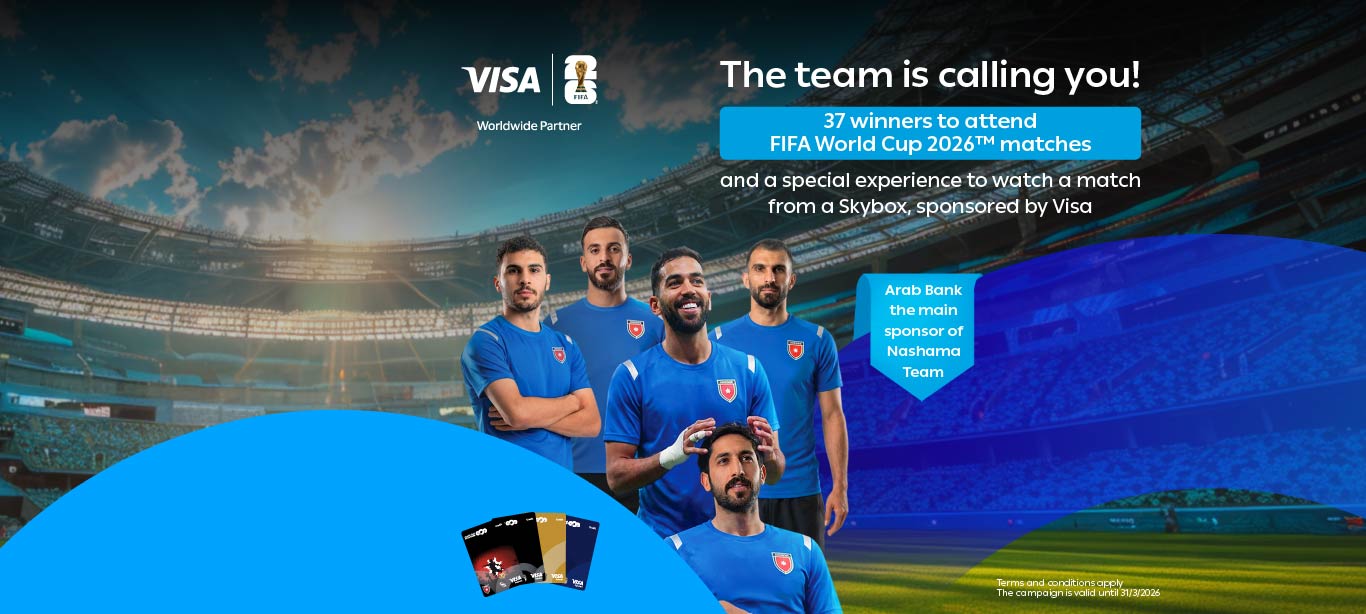 Programs Elite is a unique and highly personalized banking service that is tailor-made to meet the requirements... Cards Direct access to your accounts and many other benefits ! Loans & Credit Facilities With Arab Bank Personal Loan meeting your personal requirements couldn’t be easier or more convenient. Accounts Valid personal identification document for Jordanians (civil status ID or military certificate of appointment for the... Insurance Solutions Education Plans, Life insurance Plan, House Insurance Plan , Office Insurance Plan , Retirement Plans, Personal... Remittance Services For more information, please call our Customer Care Center on 4600900 or 0791600900 Safe Deposit Boxes Enjoy peace of mind with complete security and privacy for all your valuables, whether it may... Environmentally Friendly products & Services Arab Bank offers a wide variety of environmentally friendly products and services, designed specifically to provide... Arabi Points Program Arabi Points is Arab Bank’s customer relationship based loyalty program that grants you points based on... Wealth Management With your individual needs and goals at the forefront of our activities, Arab Bank offers you... Arabi MobiCash "Arabi MobiCash" is a mobile payment service, designed to be an easy, convenient and secure payment... e-Tawfeer PLUS Introducing e-Tawfeer PLUS: Everybody Wins, Everyday! Discover a new way of saving with e-Tawfeer PLUS The first digital... Arabi Health In partnership with “FittiCoin”, Arab Bank announces a new service: “Arabi Fitness”, aiming to encourage a... فرص عقارية مميزة للبيع Arabi e-Tadawul Welcome to “Arabi e-Tadawul”! Arabi e-Tadawul is an exclusive service offered to Arab Bank customers allowing them... "Junior" app Children are our future! We bring you the brand new “Junior” app, specially designed for children and... -