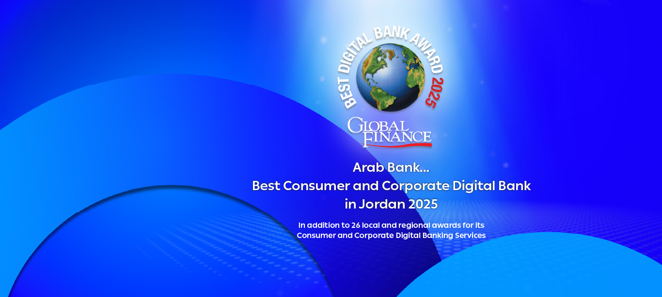Programs Elite is a unique and highly personalized banking service that is tailor-made to meet the requirements... Cards Direct access to your accounts and many other benefits ! Loans & Credit Facilities With Arab Bank Personal Loan meeting your personal requirements couldn’t be easier or more convenient. Accounts Valid personal identification document for Jordanians (civil status ID or military certificate of appointment for the... Insurance Solutions Education Plans, Life insurance Plan, House Insurance Plan , Office Insurance Plan , Retirement Plans, Personal... Remittance Services For more information, please call our Customer Care Center on 4600900 or 0791600900 Safe Deposit Boxes Enjoy peace of mind with complete security and privacy for all your valuables, whether it may... Environmentally Friendly products & Services Arab Bank offers a wide variety of environmentally friendly products and services, designed specifically to provide... Arabi Points Program Arabi Points is Arab Bank’s customer relationship based loyalty program that grants you points based on... Wealth Management With your individual needs and goals at the forefront of our activities, Arab Bank offers you... Arabi MobiCash "Arabi MobiCash" is a mobile payment service, designed to be an easy, convenient and secure payment... e-Tawfeer PLUS Introducing e-Tawfeer PLUS: Everybody Wins, Everyday! Discover a new way of saving with e-Tawfeer PLUS The first digital... Arabi Health In partnership with “FittiCoin”, Arab Bank announces a new service: “Arabi Fitness”, aiming to encourage a... Arabi e-Tadawul Welcome to “Arabi e-Tadawul”! Arabi e-Tadawul is an exclusive service offered to Arab Bank customers allowing them... "Junior" app Children are our future! We bring you the brand new “Junior” app, specially designed for children and... -
